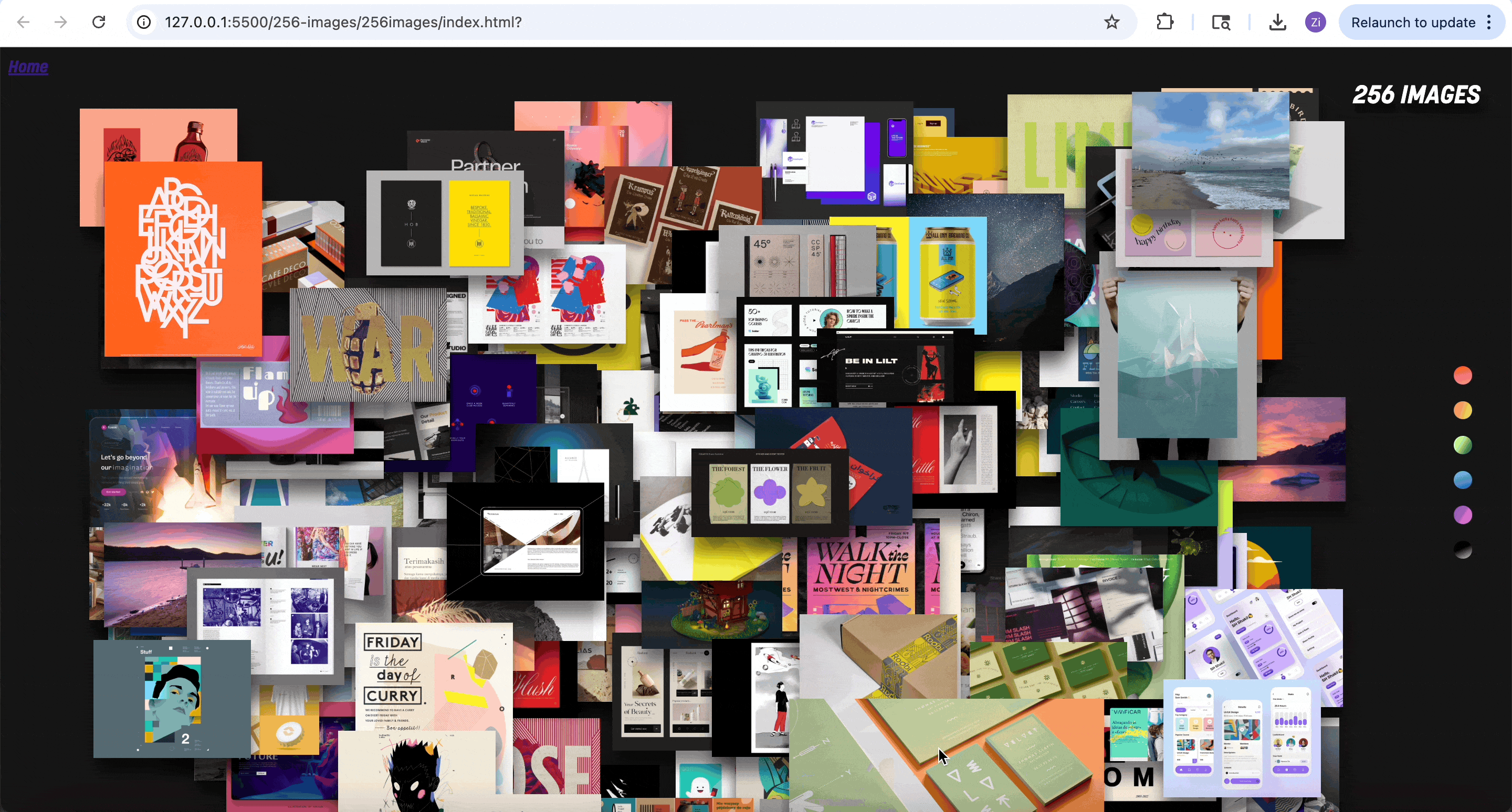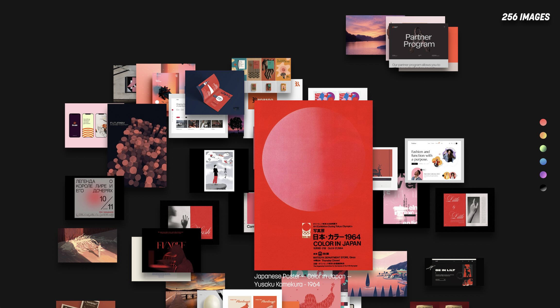 This is an experimental website I created to mimic and visualize my brainstorming process. I used Airtable to build a custom API library and collected a total of 256 images that I’ve used as inspiration over the years. All the images are stacked on the homepage, and users can freely drag them around the screen to reorganize—just like iterating on design ideas. The color dots on the right side serve as a simple filter: users can click on a color they like to display only the images that share that hue.